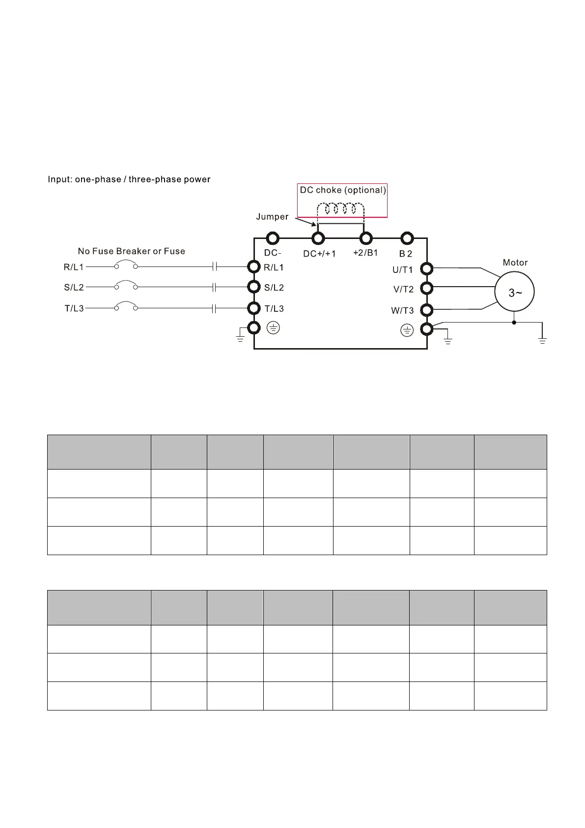 Installation: Install the DC reactor between terminals +1 and +2. Remove the jumper, before installing the