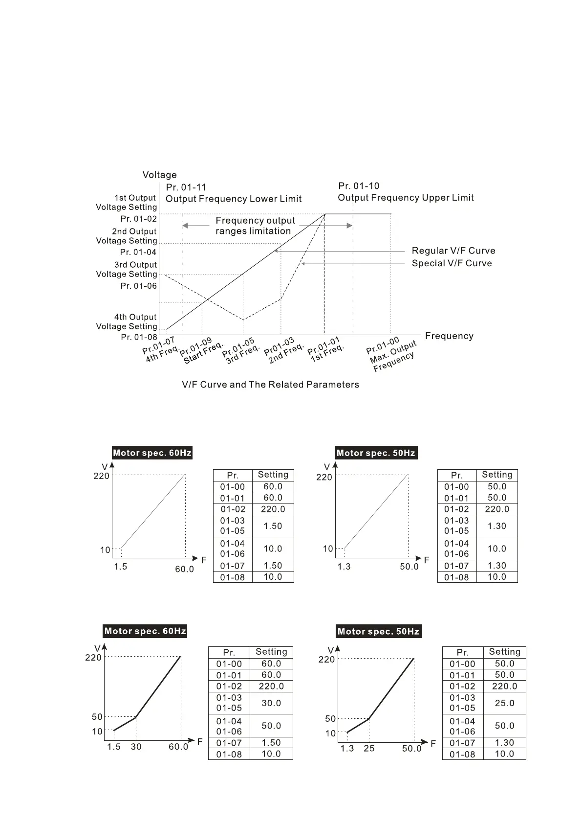 The diagram below shows the V/F curve for motor 1. You can also find the V/F curve for motor 2