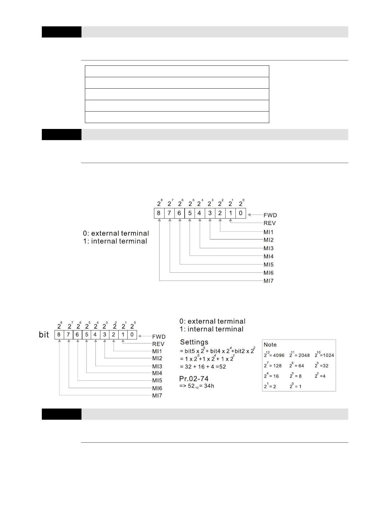 Example: if the MI1, MI3, MI4 are triggered by virtual terminals, then Pr.02-74 = 34h.