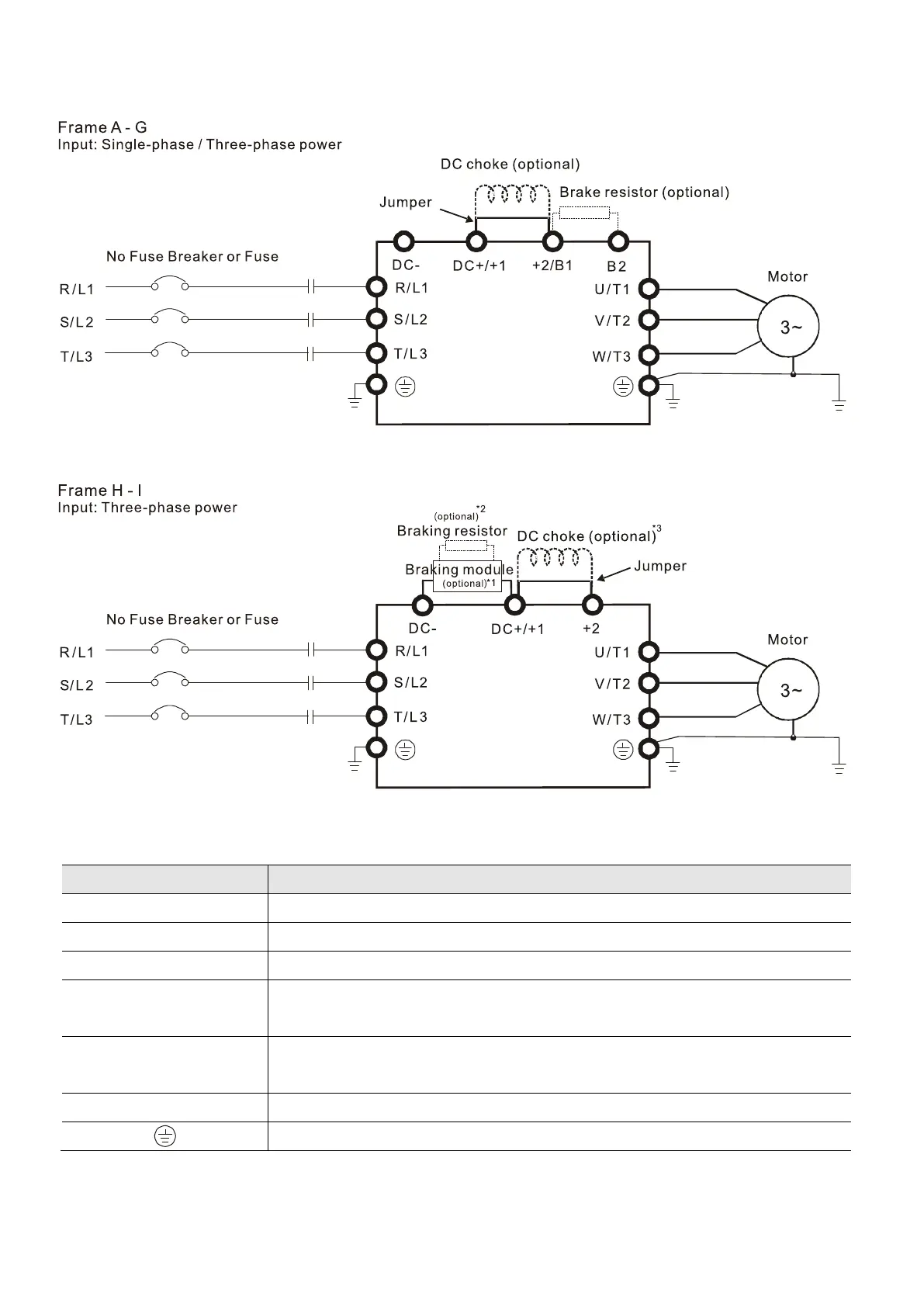 U/T1, V/T2, W/T3 Motor output terminals for connecting three-phase