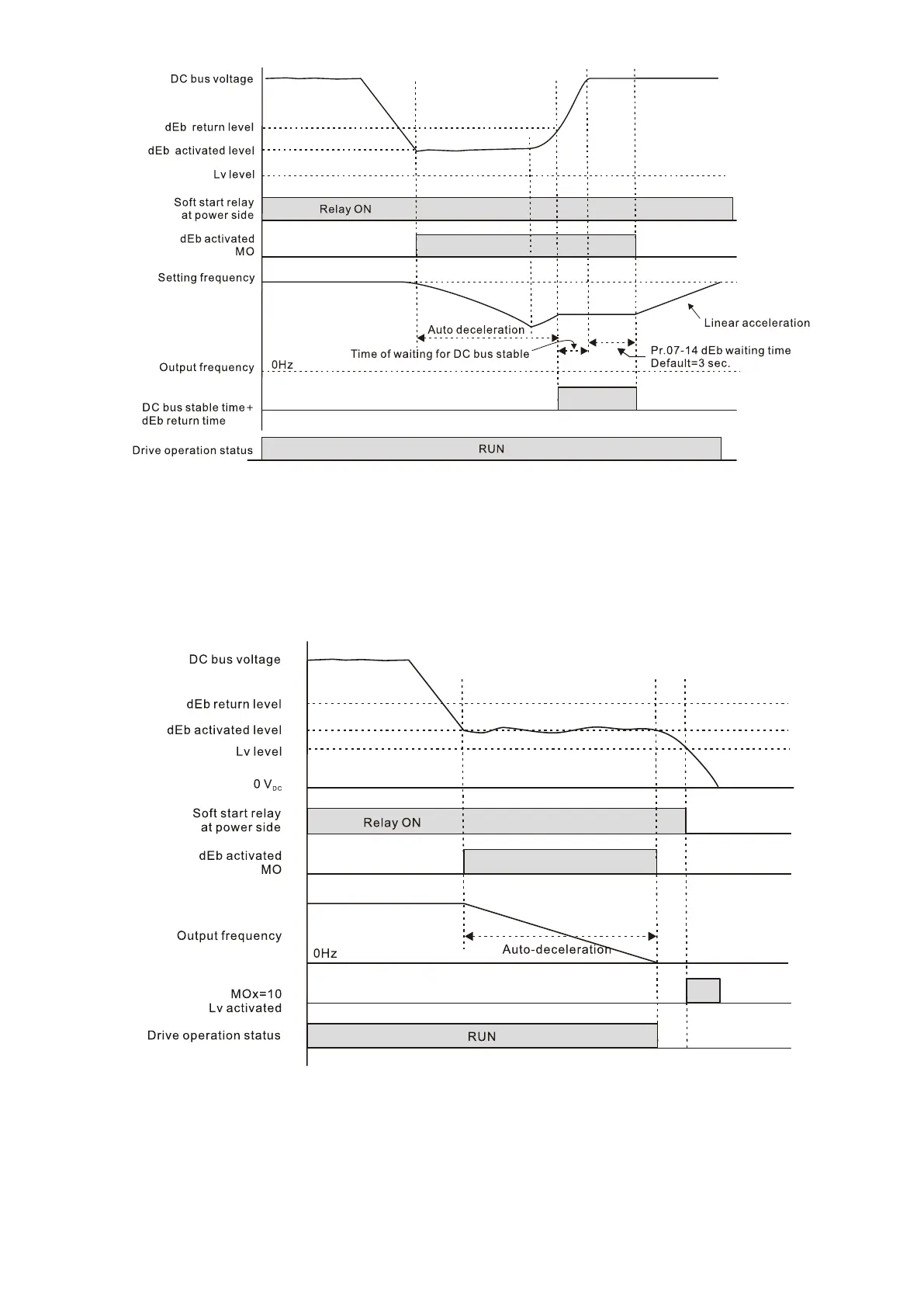 Pr.07-13=2 “dEb active, DC bus voltage returns, the output frequency returns” and power does not