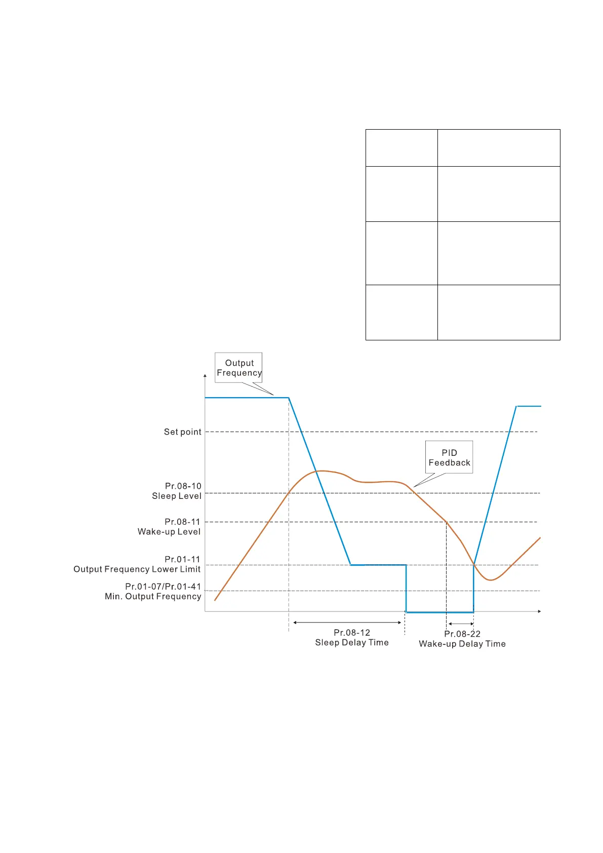 When the PID feedback value reaches the wake-up percentage, the drive starts to count the
