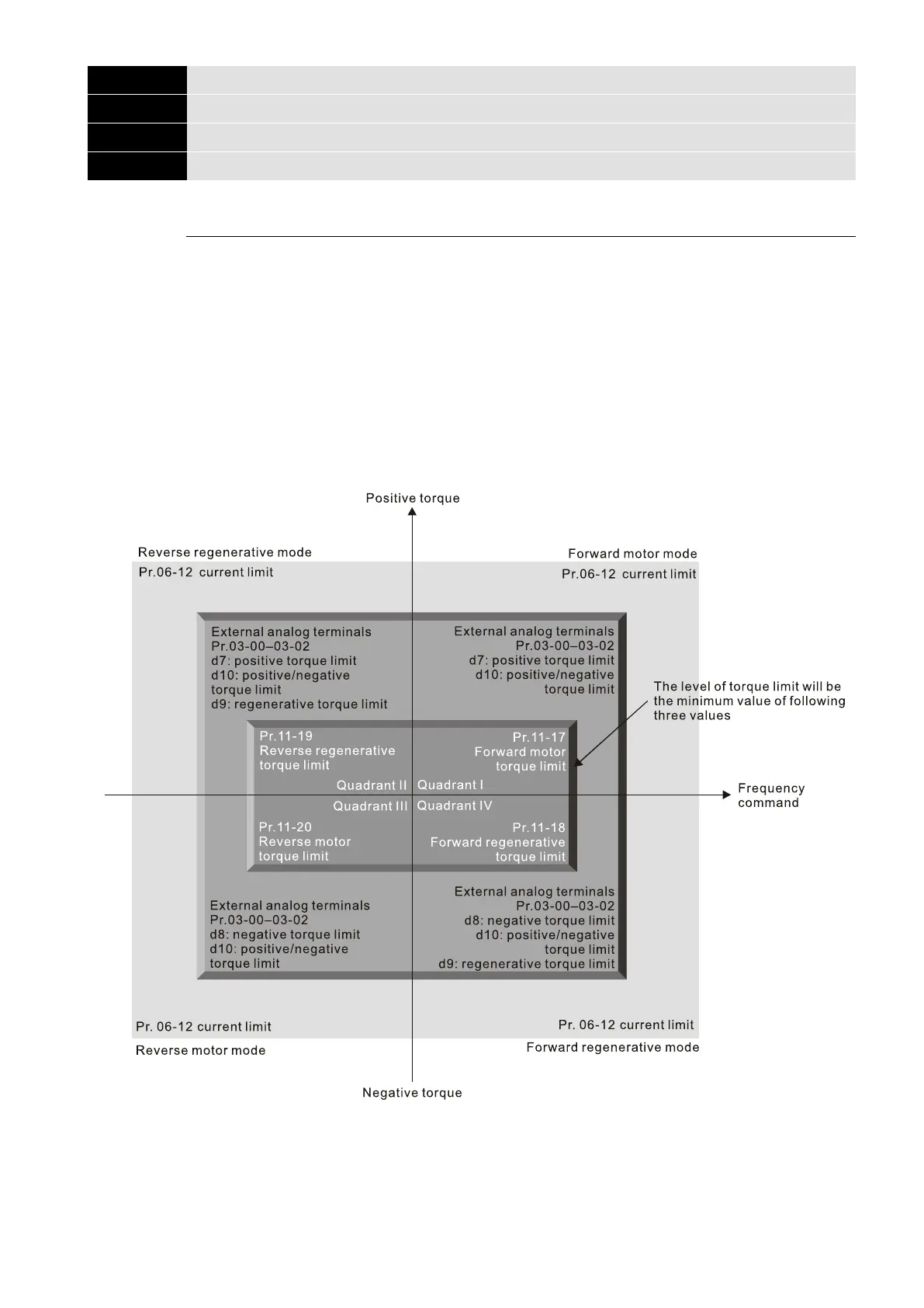 value between Pr.11-17–11-20 and Pr.06-12 becomes the current output torque limit.