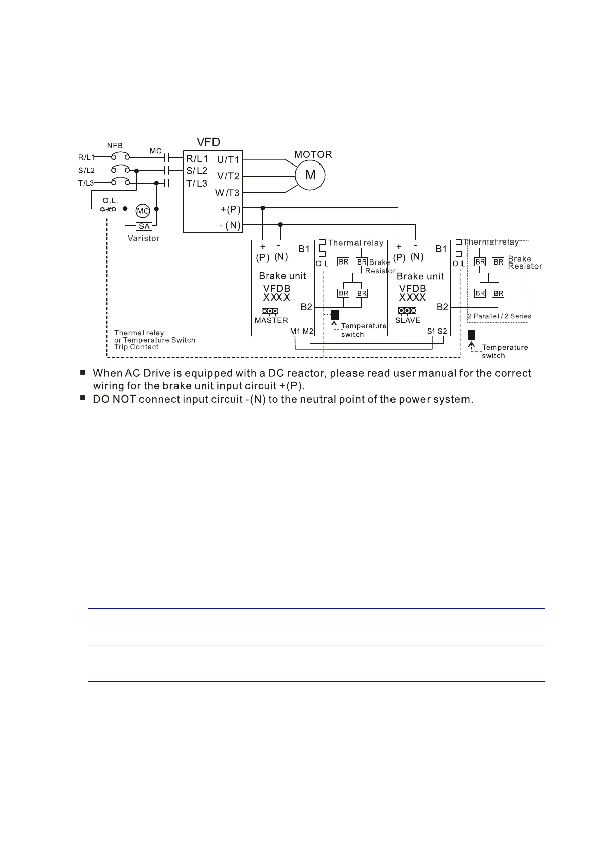 4. When using more than two brake units, the equivalent resistor value of the parallel brake unit cannot be less