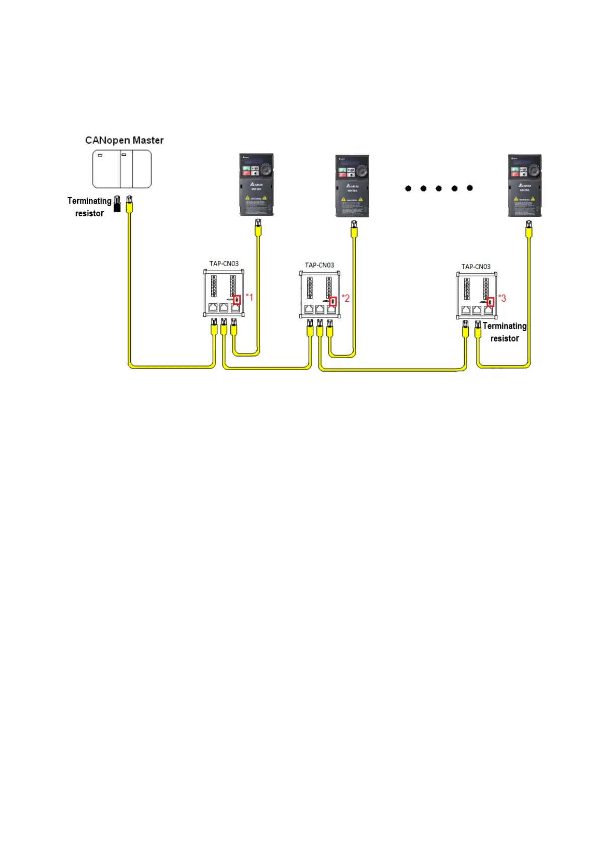 an external CANopen communication splitter box (TAP-CN03) for built-in CANopen wiring to