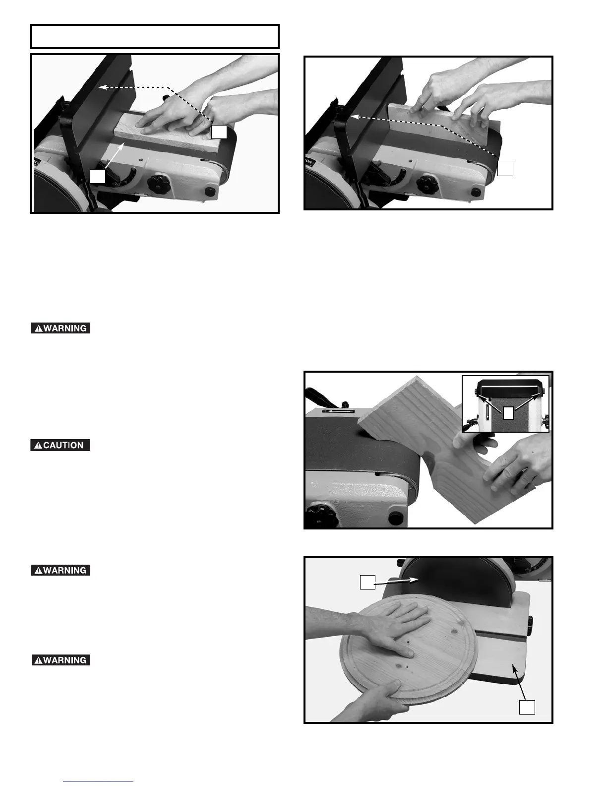 SANDING BELT (B) TO AVOID TRAPPING THE WORKPIECE OR YOUR FINGERS BETWEEN THE