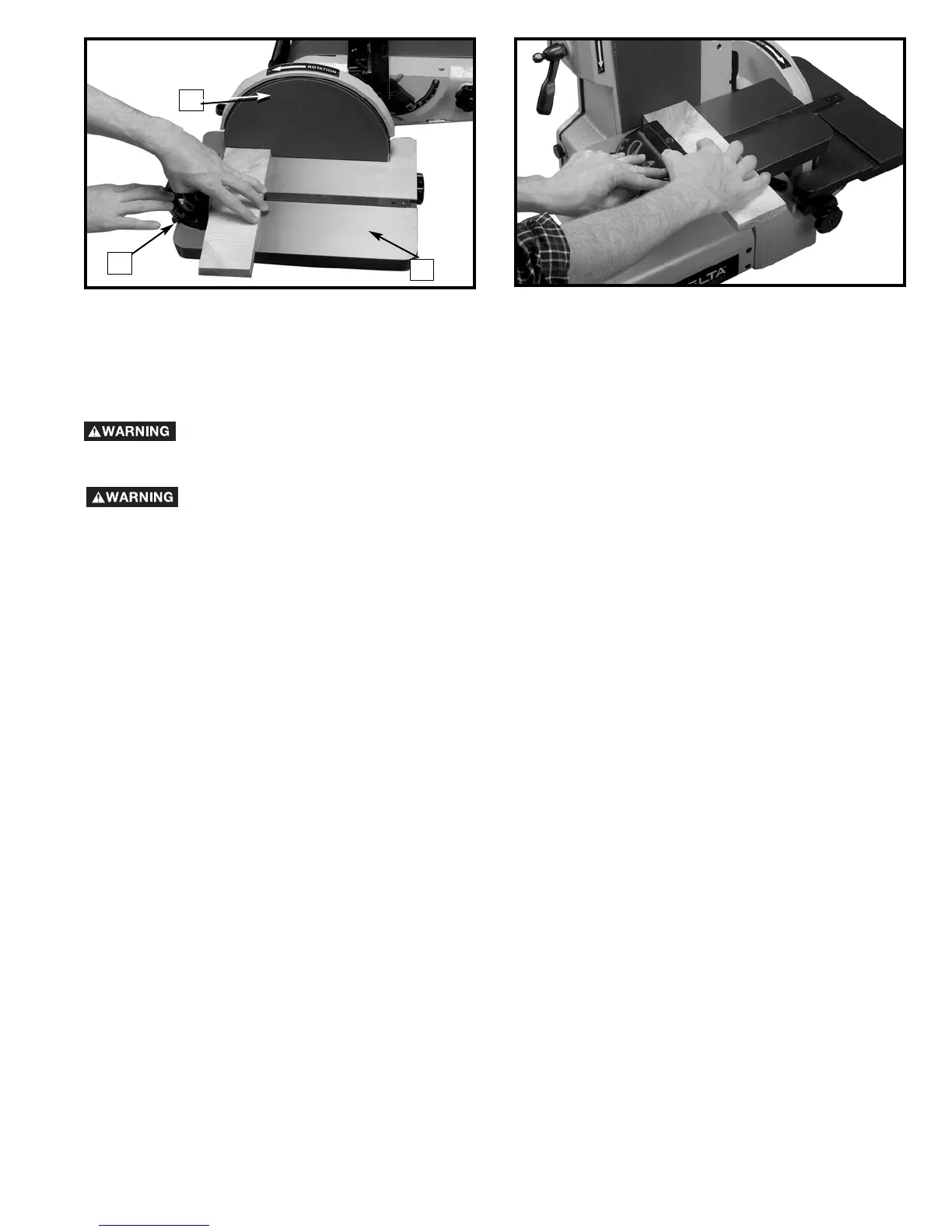FROM THE SANDING DISC (B) TO AVOID TRAPPING THE WORK OR FINGERS BETWEEN THE