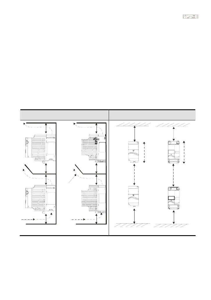 with enough space in-between. When installing one AC motor drive below another one, use a