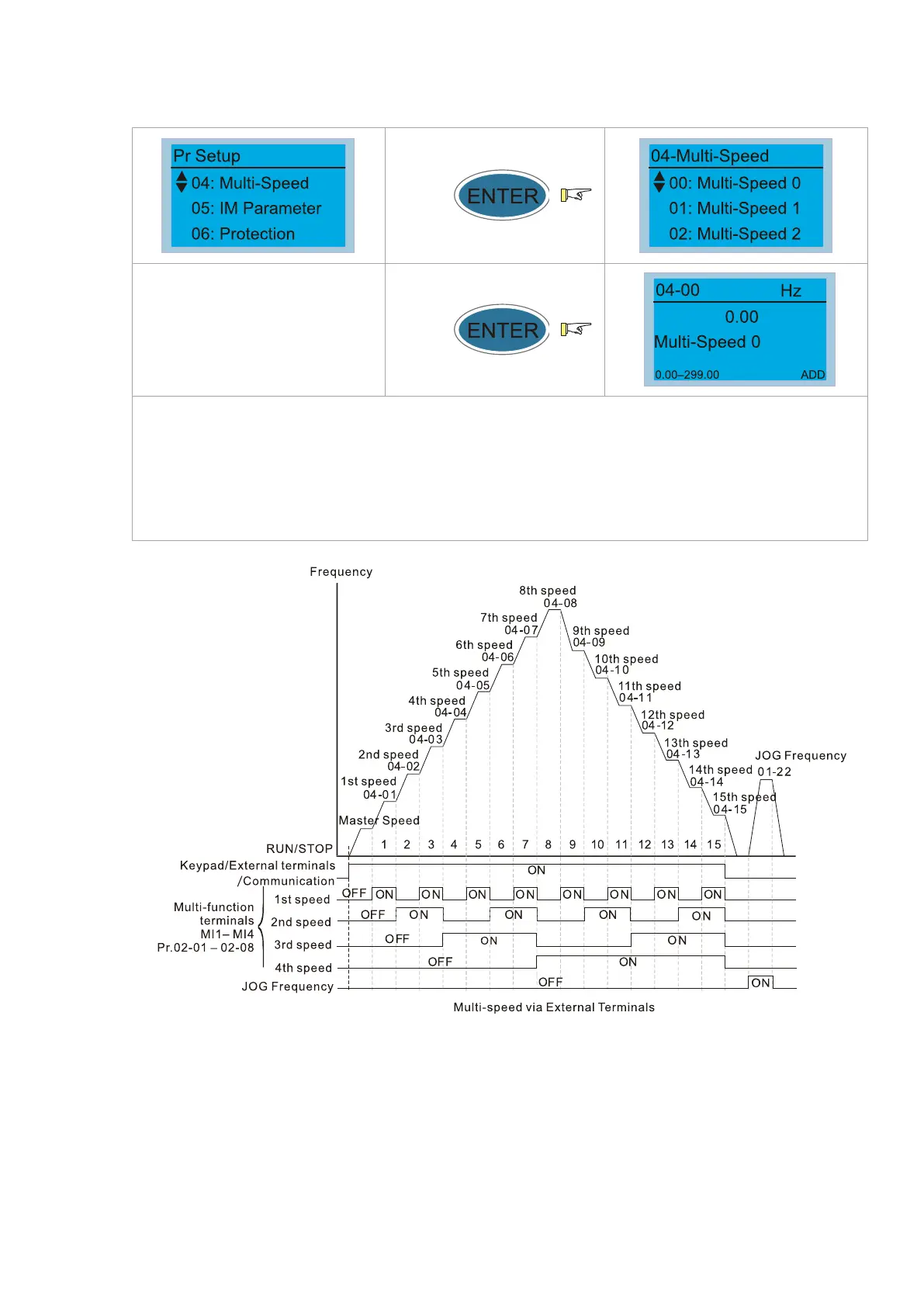 drive multi-step speeds (including the master frequency, in total 16 speeds). Pr.04-00Pr.04-