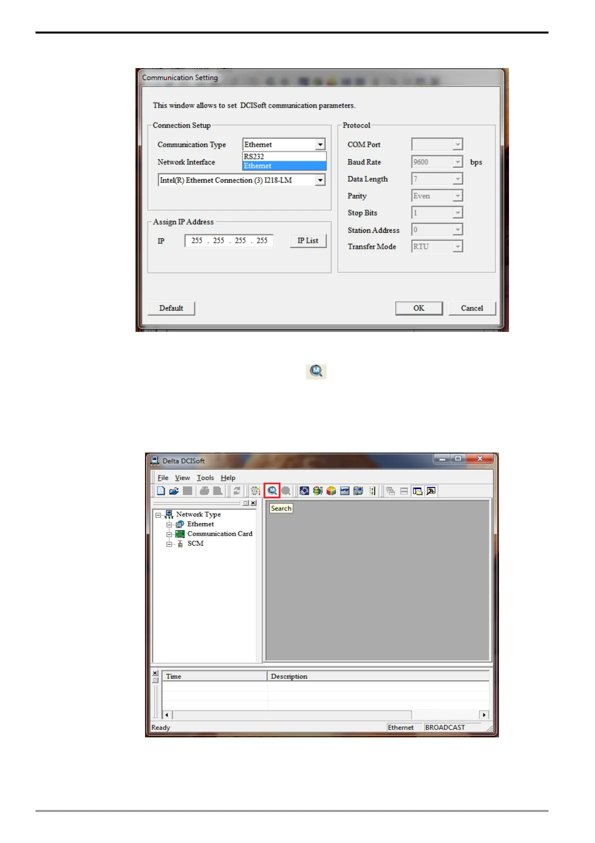 1. Click on the "Broadcast Search" icon in DCISoft to search for all Delta