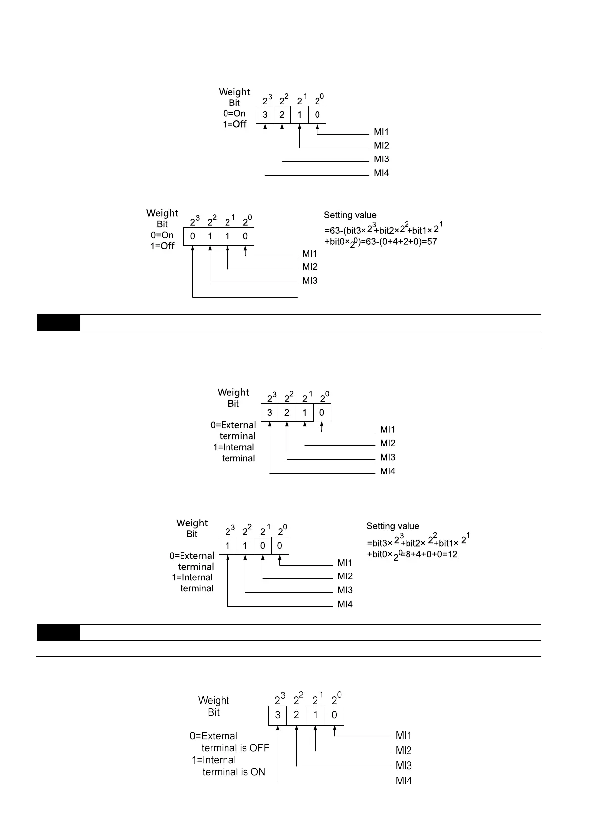 3. When MI3 (corresponds to bit2) is triggered, and the weight is 4, Pr.04-26=59 (63-4).