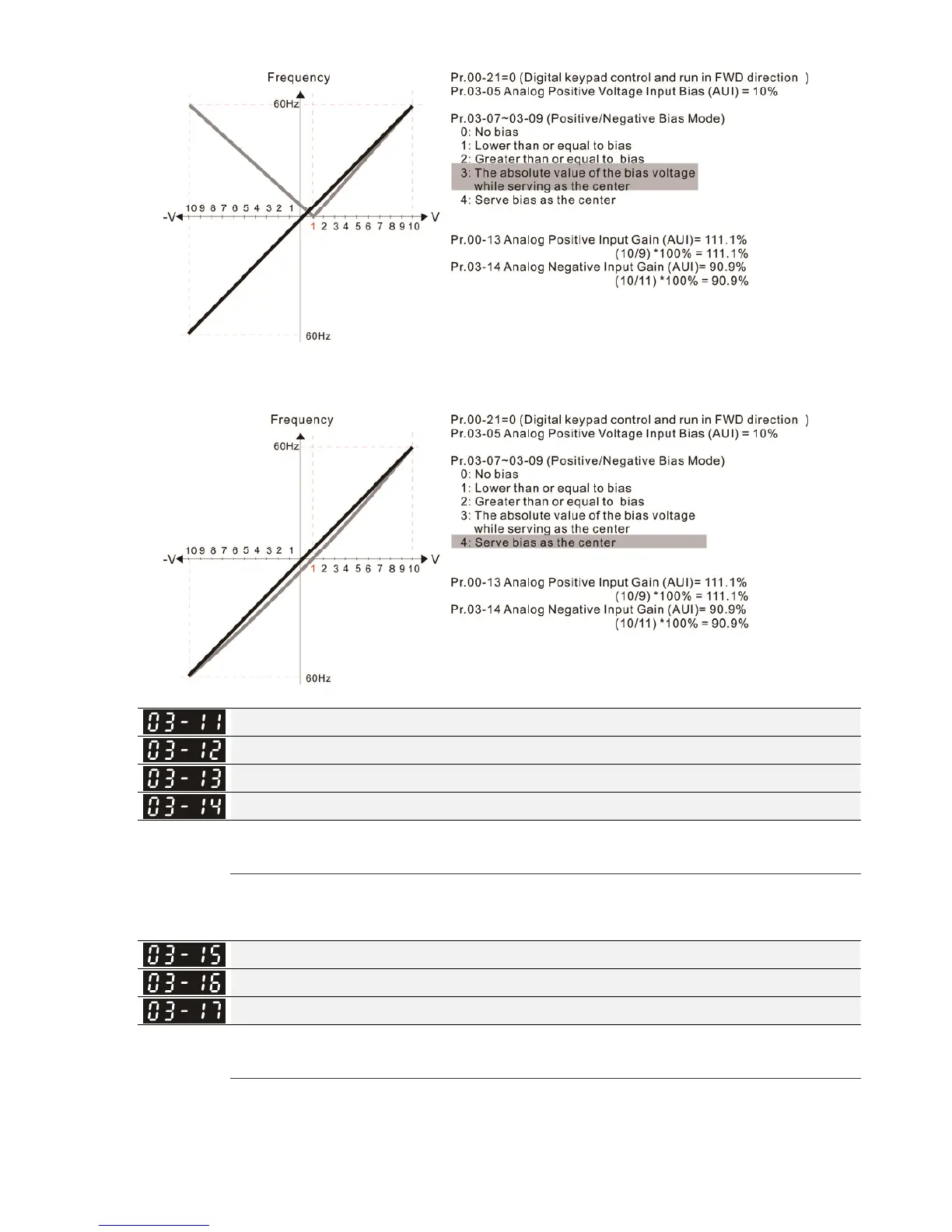 Parameters 03-03 to 03-14 are used when the source of frequency command is the analog