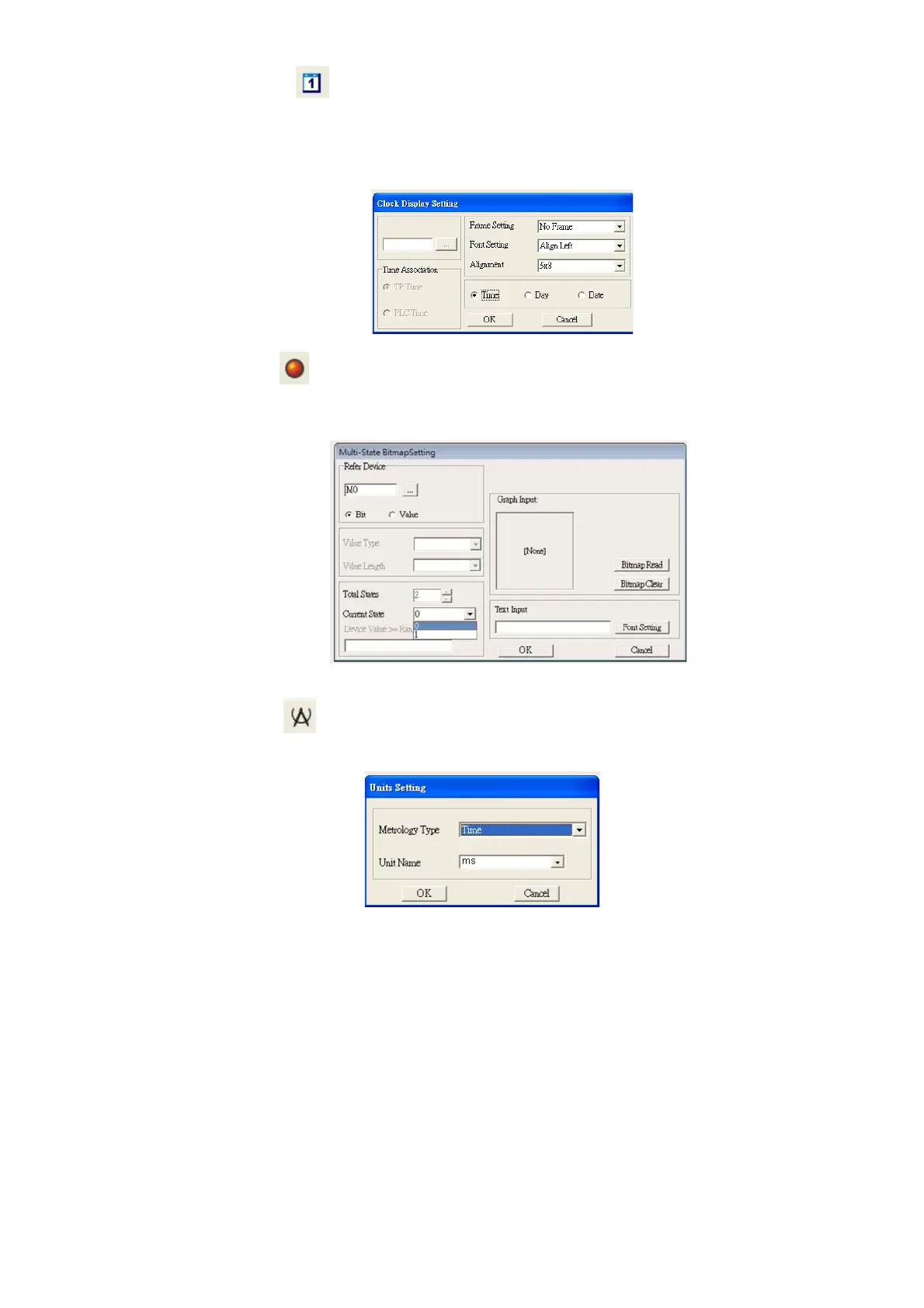 7. Clock Display Setting : The setup window of the Clock Display is shown as the image below. Time,
