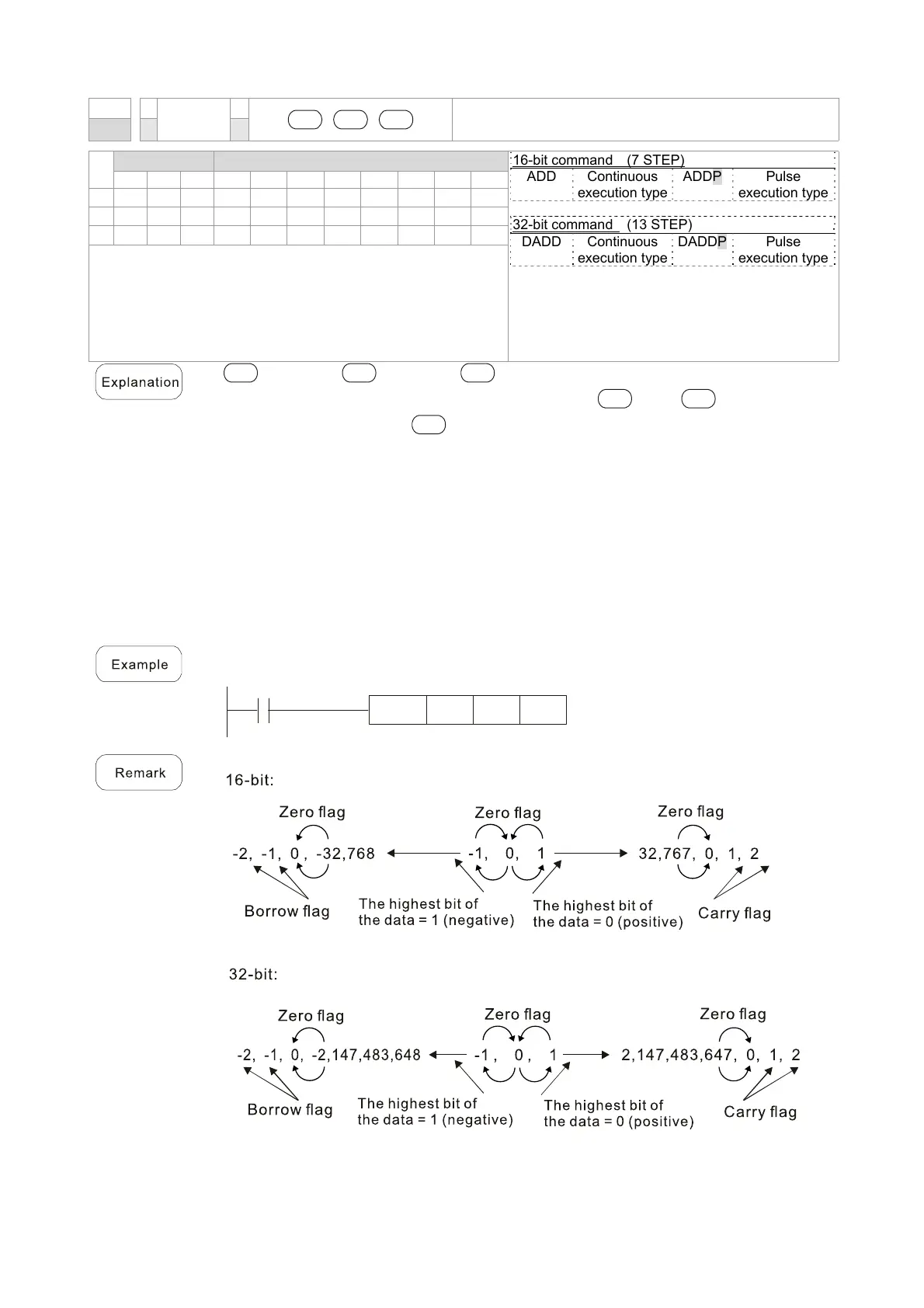 2. When calculation results are less than –32,768, the borrow flag M1021 will be