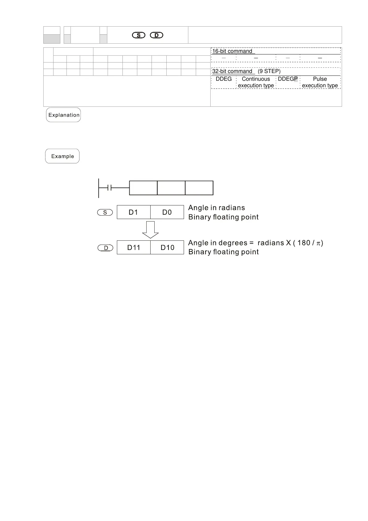 When X0=On, angle of the designated binary floating point number (D1, D0) in