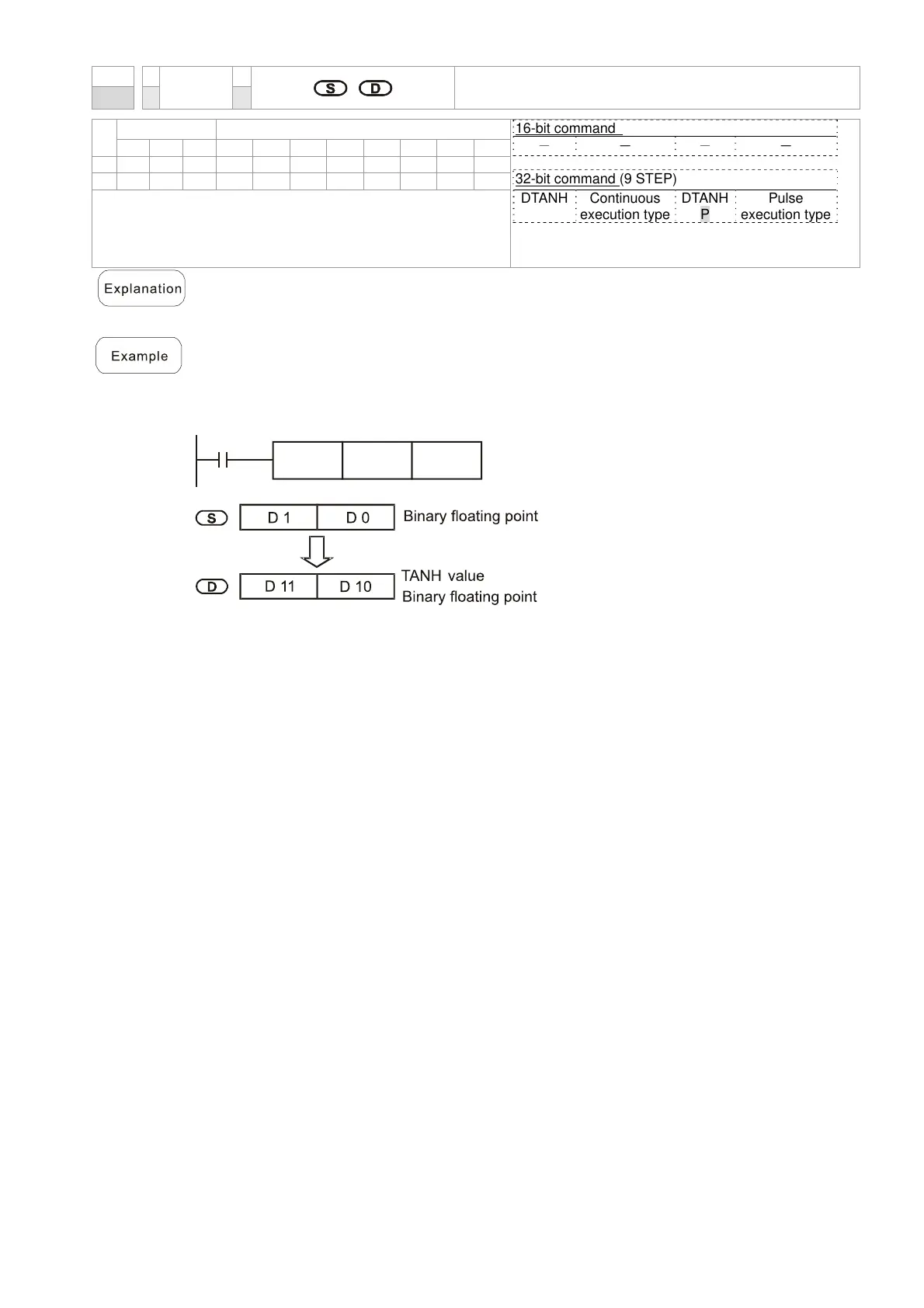 S: the designated source (binary floating point number). D: the TANH value result.