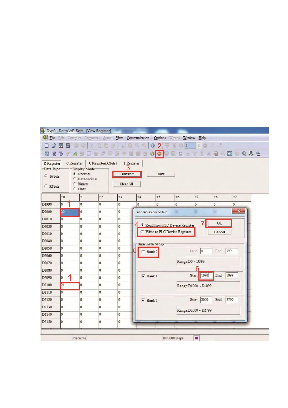 1. D2000 and D2100 are set as 20 and 21, and D2200, D2300, D2400, D2500, D2600, and D2700