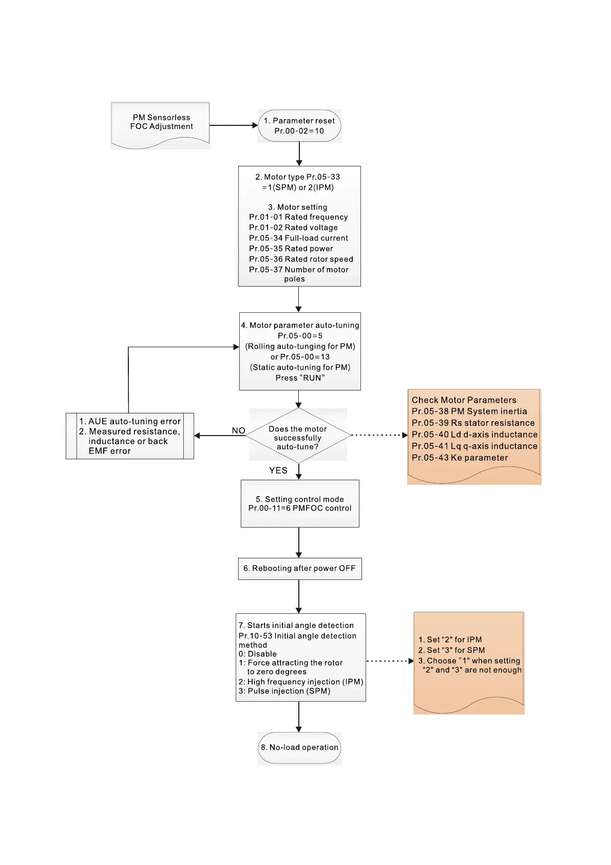 I. PM Sensorless motor parameters adjustment flowchart