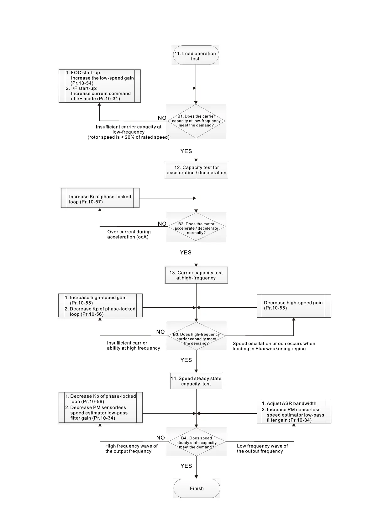III. PM Sensorless adjustment flowchart for operation starts with load