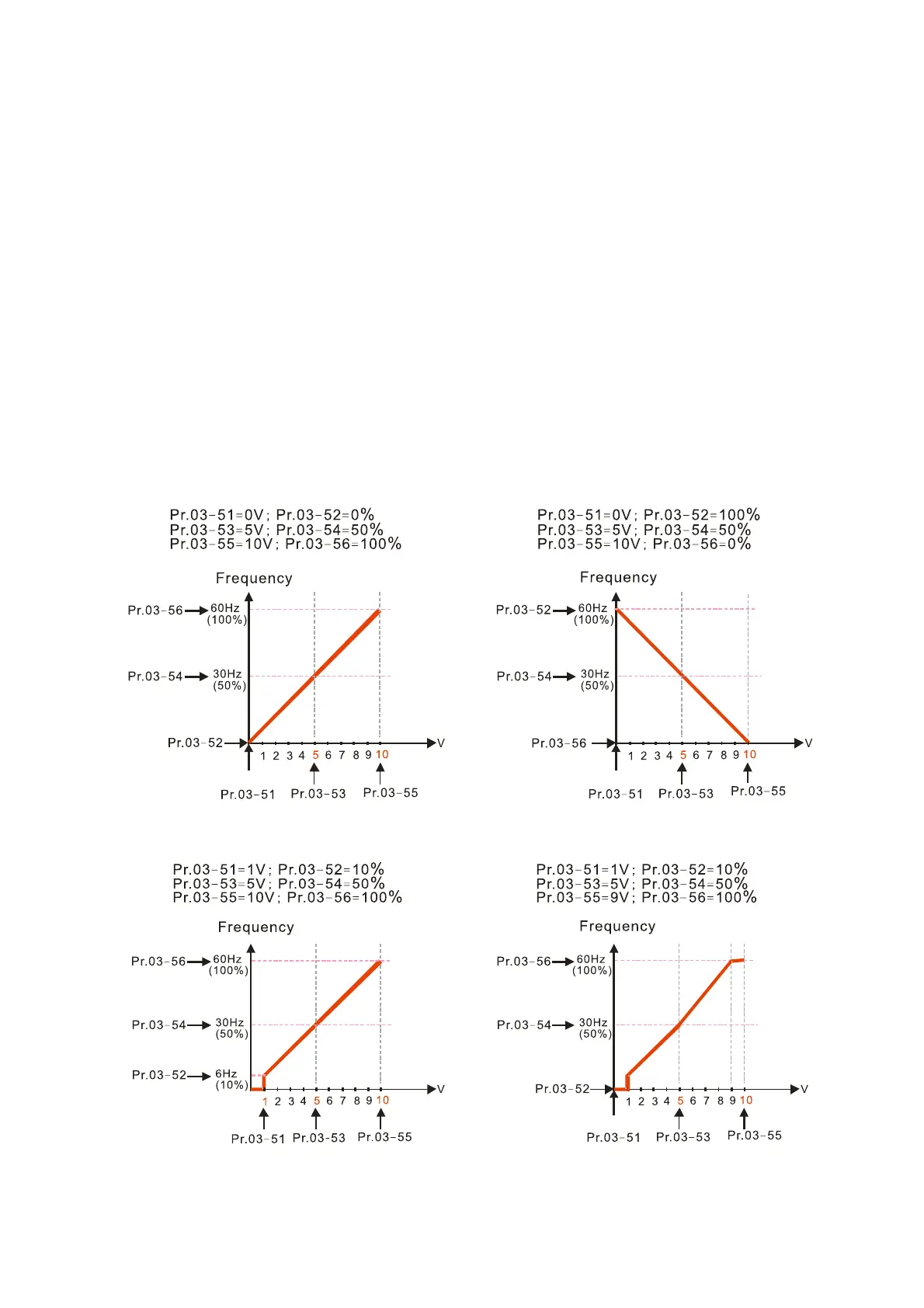 Pr.03-53 < Pr.03-55. The values for three proportional points (Pr.03-52, Pr.03-54 and Pr.03-56)