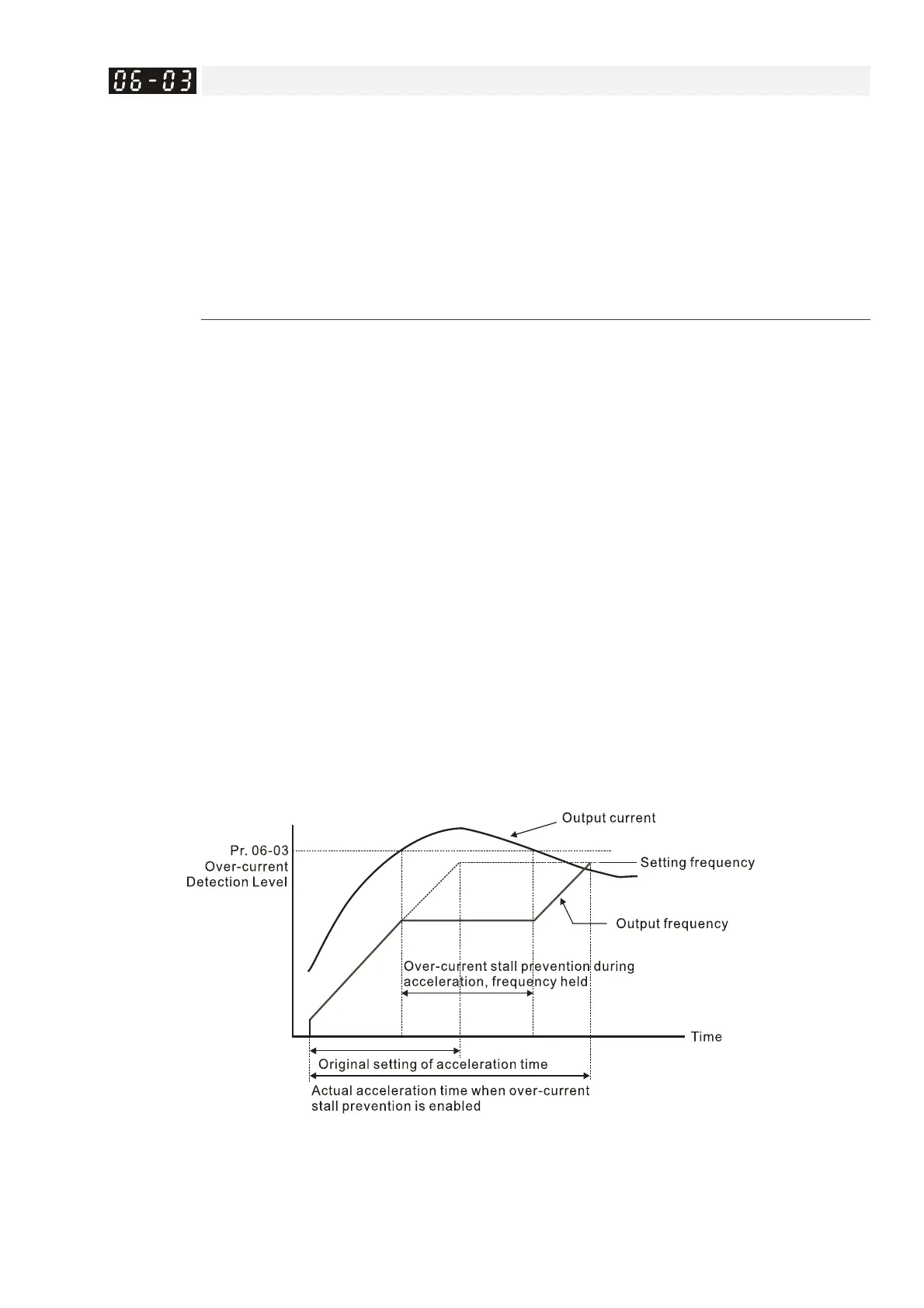 of Pr.06-03. In this case, the drive stops accelerating and keeps the output frequency constant,