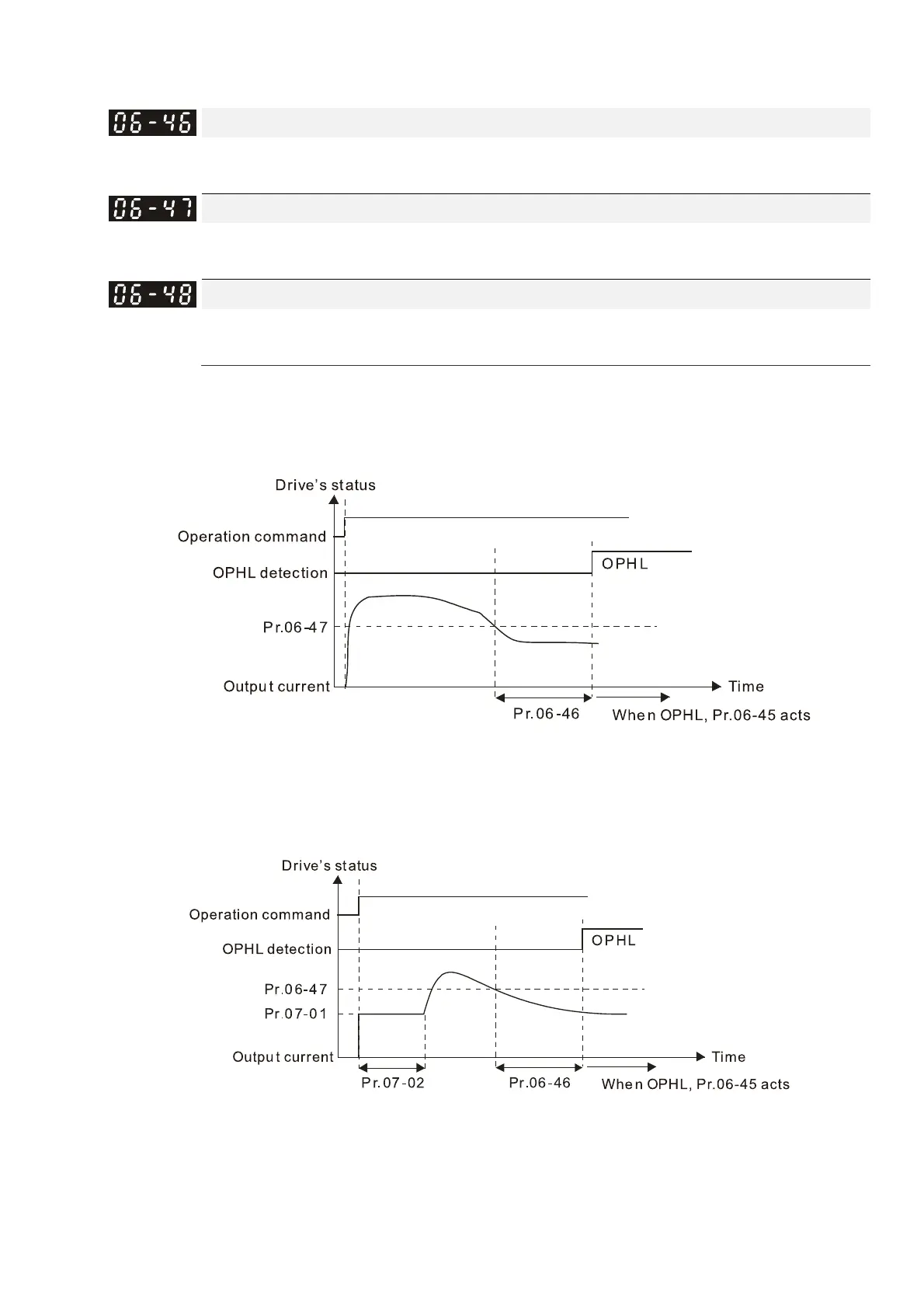 When any phase current is less than the Pr.06-47 setting, and exceeds Pr.06-46 setting time,
