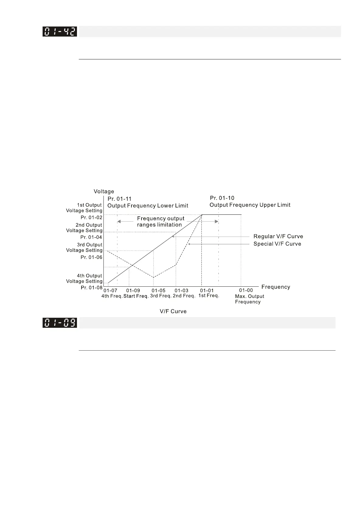 Pr. 01-35 to Pr. 01-42 is the V/F curve for the motor 2. When the multi-function input terminals Pr.