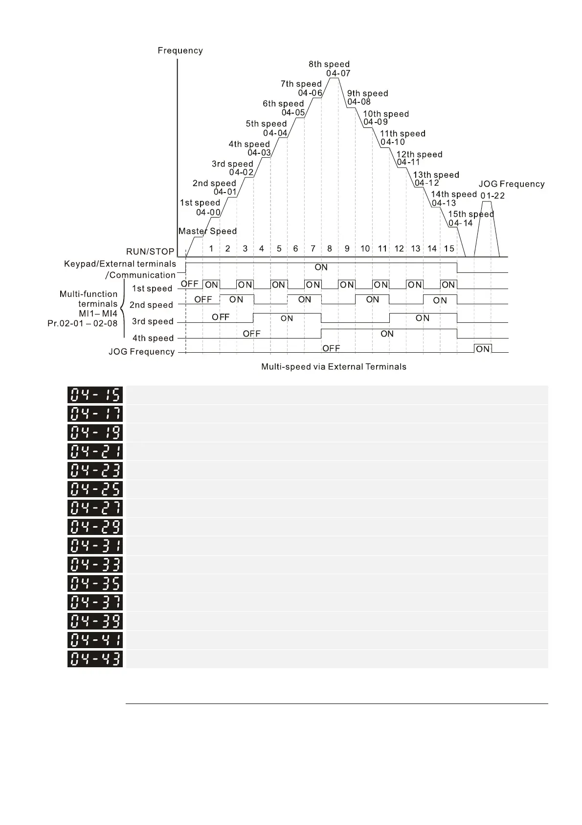 Pr.02-01 = 1, Pr.02-02 = 2, Pr.02-03 = 3, Pr.02-04 = 4 by selecting the P2P target position with the