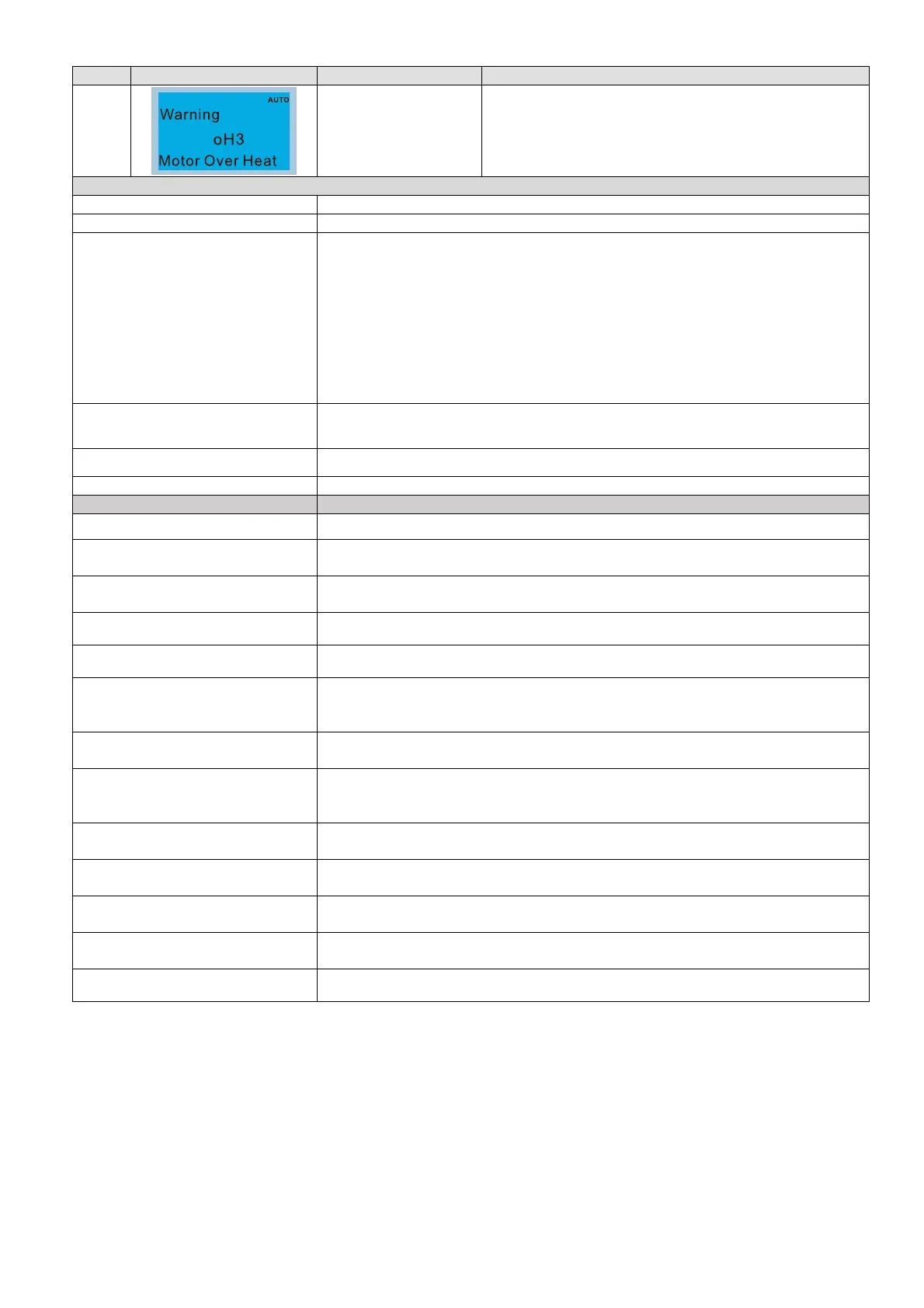 When Pr.06-29=0, oH3 displays “Warning”. When the temperature is < Pr.06-56
