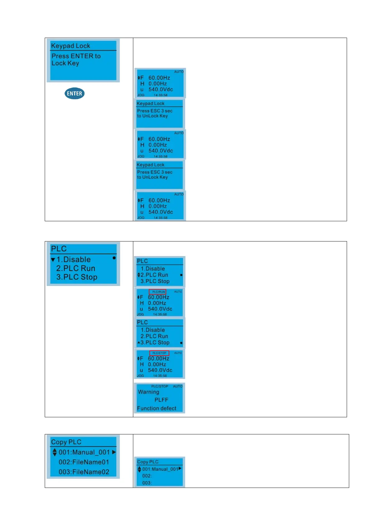3: PLC Stop), the PLC status displays on main screen (Delta default setting).