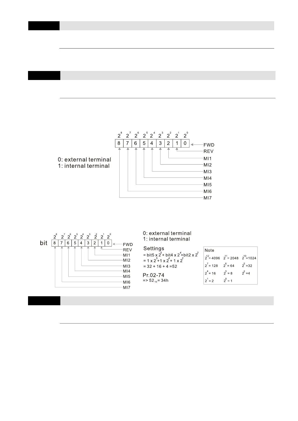 Example: if the MI1, MI3, MI4 are triggered by virtual terminals, then Pr.02-74 = 34h.