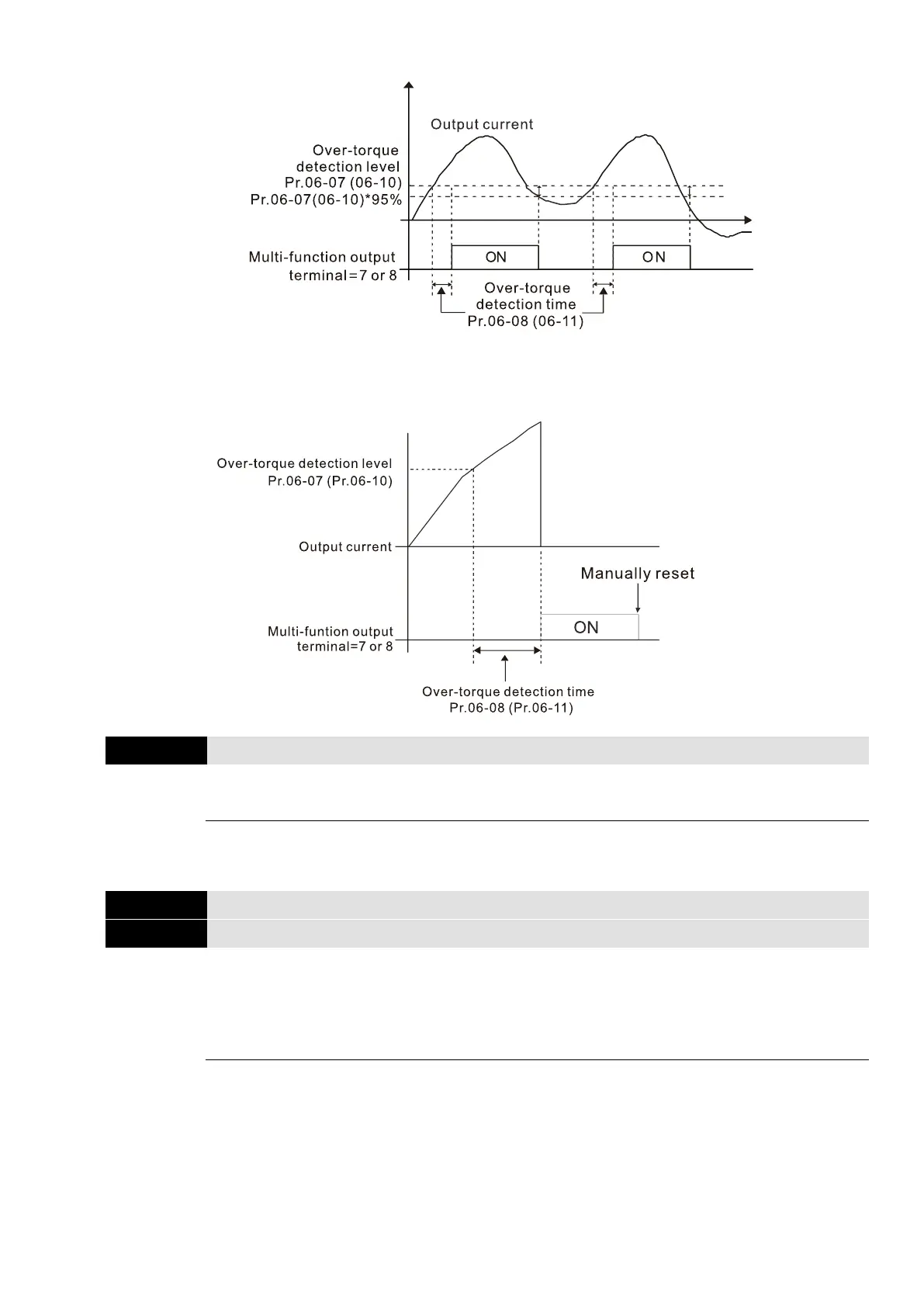 When you set Pr.06-06 or Pr.06-09 to 2 or 4, an ot1 / ot2 warning displays and the drive stops