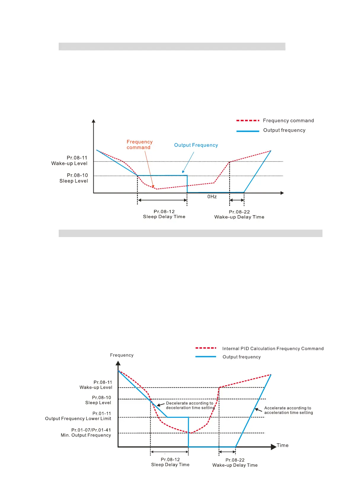When the PID calculation Frequency command reaches the sleep level (Pr.08-10), the drive