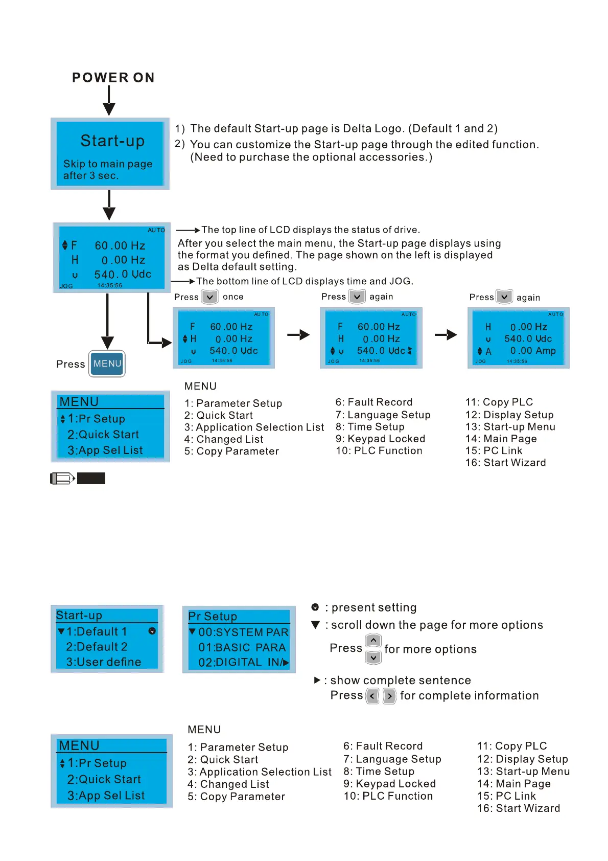 2. When Power ON, it displays the Start-up page and then the main page. The main page displays Delta’s