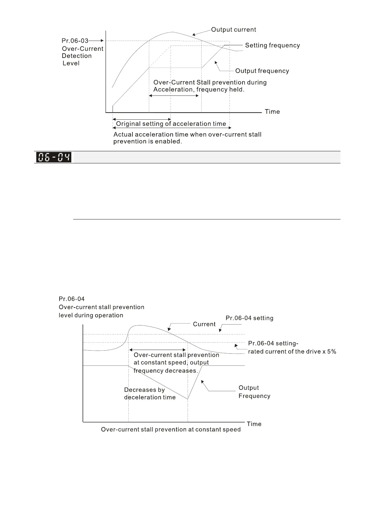 decreases output frequency (according to Pr.06-05) to prevent the motor from stalling. If the