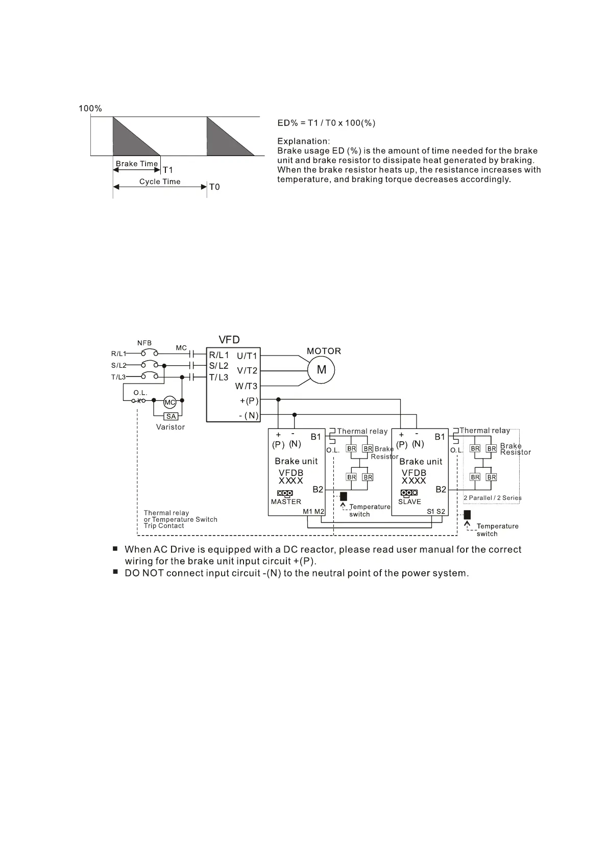 4. When using more than two brake units, the equivalent resistor value of the parallel brake unit cannot be less