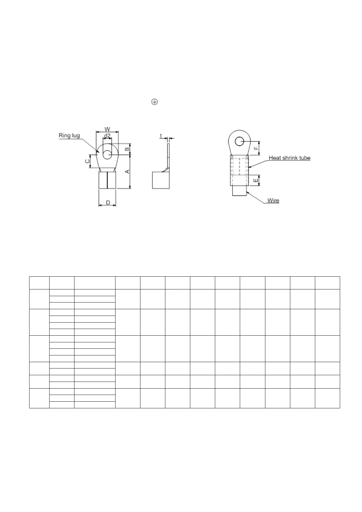 Use the specified ring lug for main circuit terminal wiring. See Figure 5-6 and Figure 5-7 for ring lug
