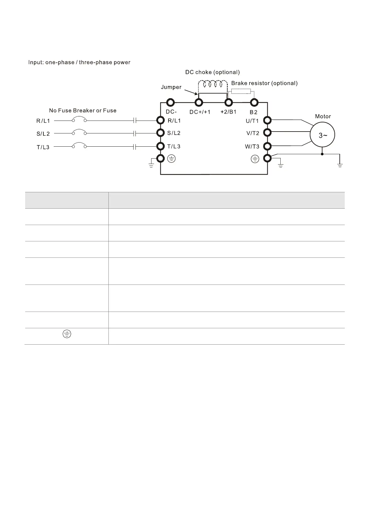 R/L1, S/L2, T/L3 Mains input terminals three-phase
