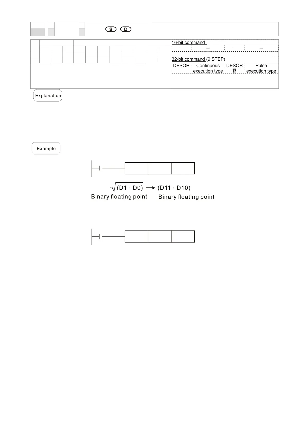 When X0=On, the square root is taken of the binary floating point number (D1,
