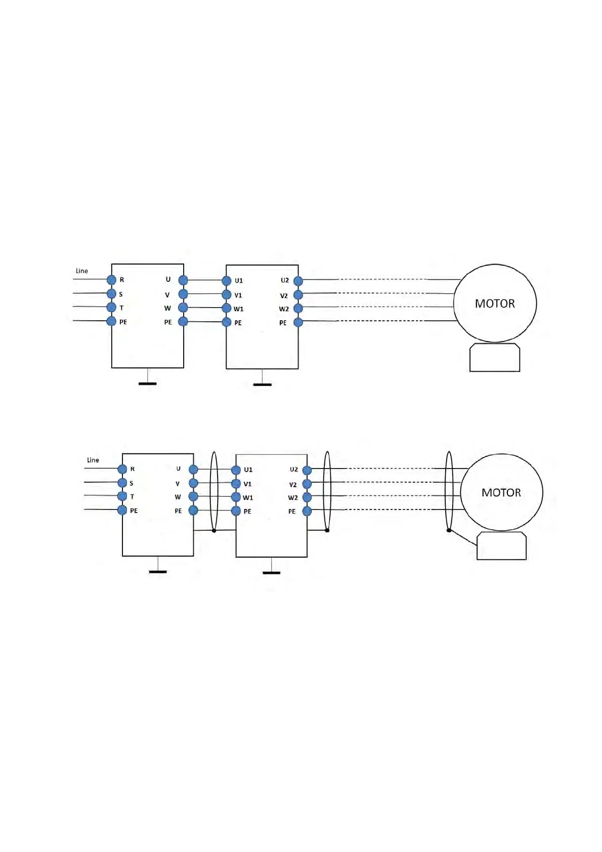 Install a Sine-wave filter in series between the three output phases U V W and the motor, as shown