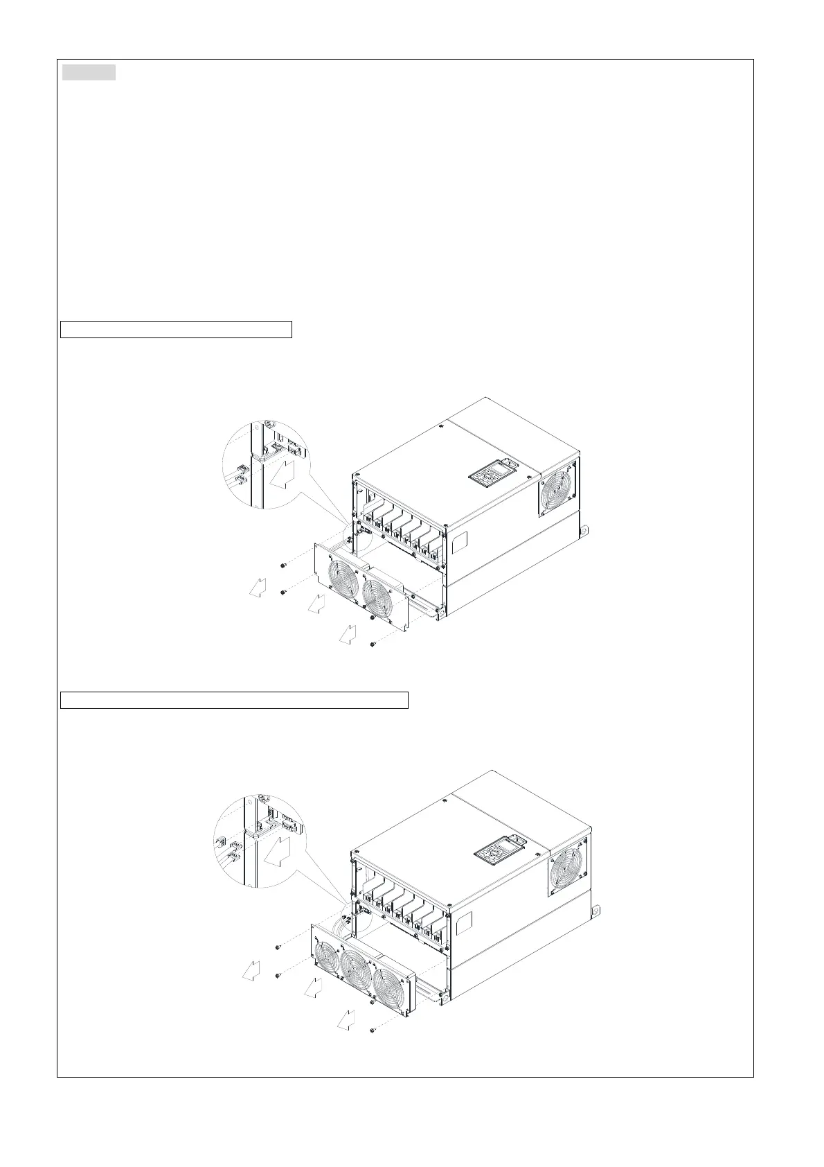 1. Loosen screw 1–4 and disconnect fan power and pull out the fan. (As shown in the enlarged picture).