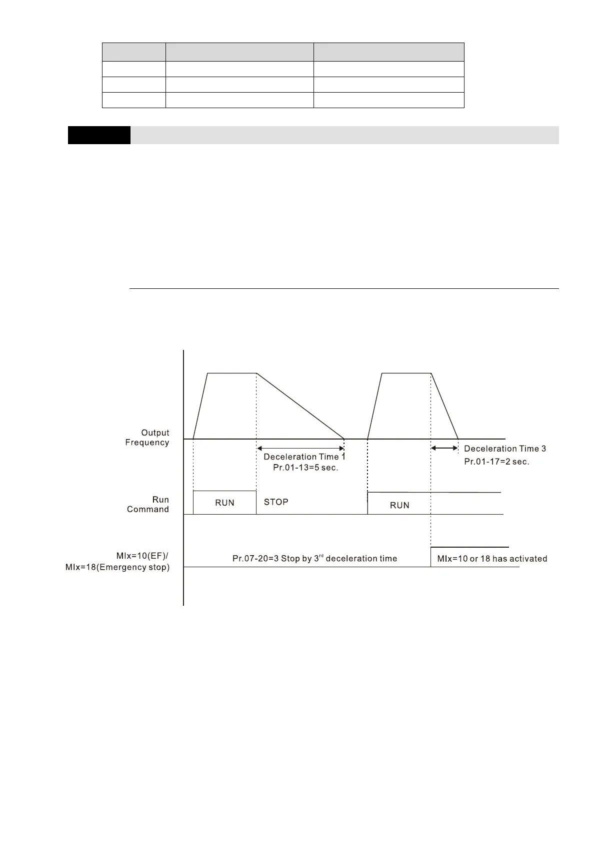 When the multi-function input terminal setting is set to 10 (EF input) or 18 (force to stop) and the