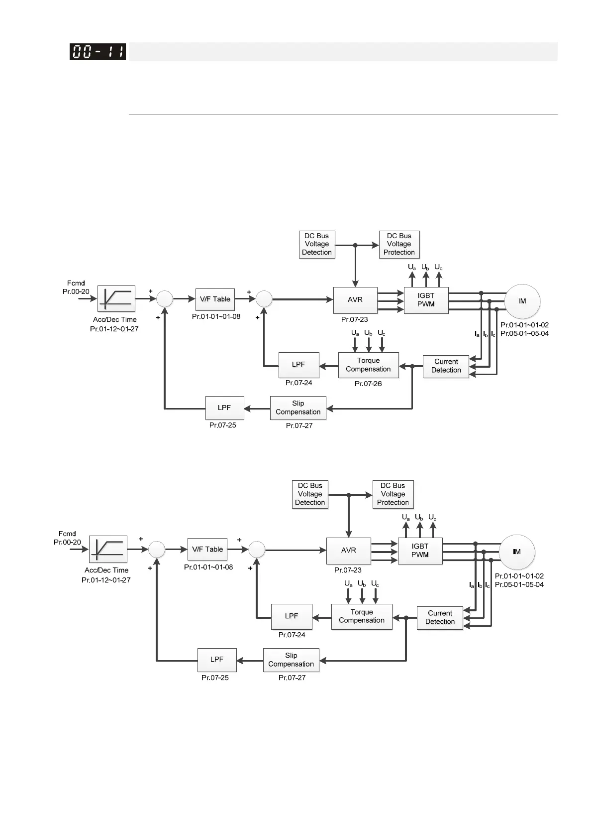 When Pr.00-10=0, and you set Pr.00-11 to 0, the V/F control diagram is as follows: