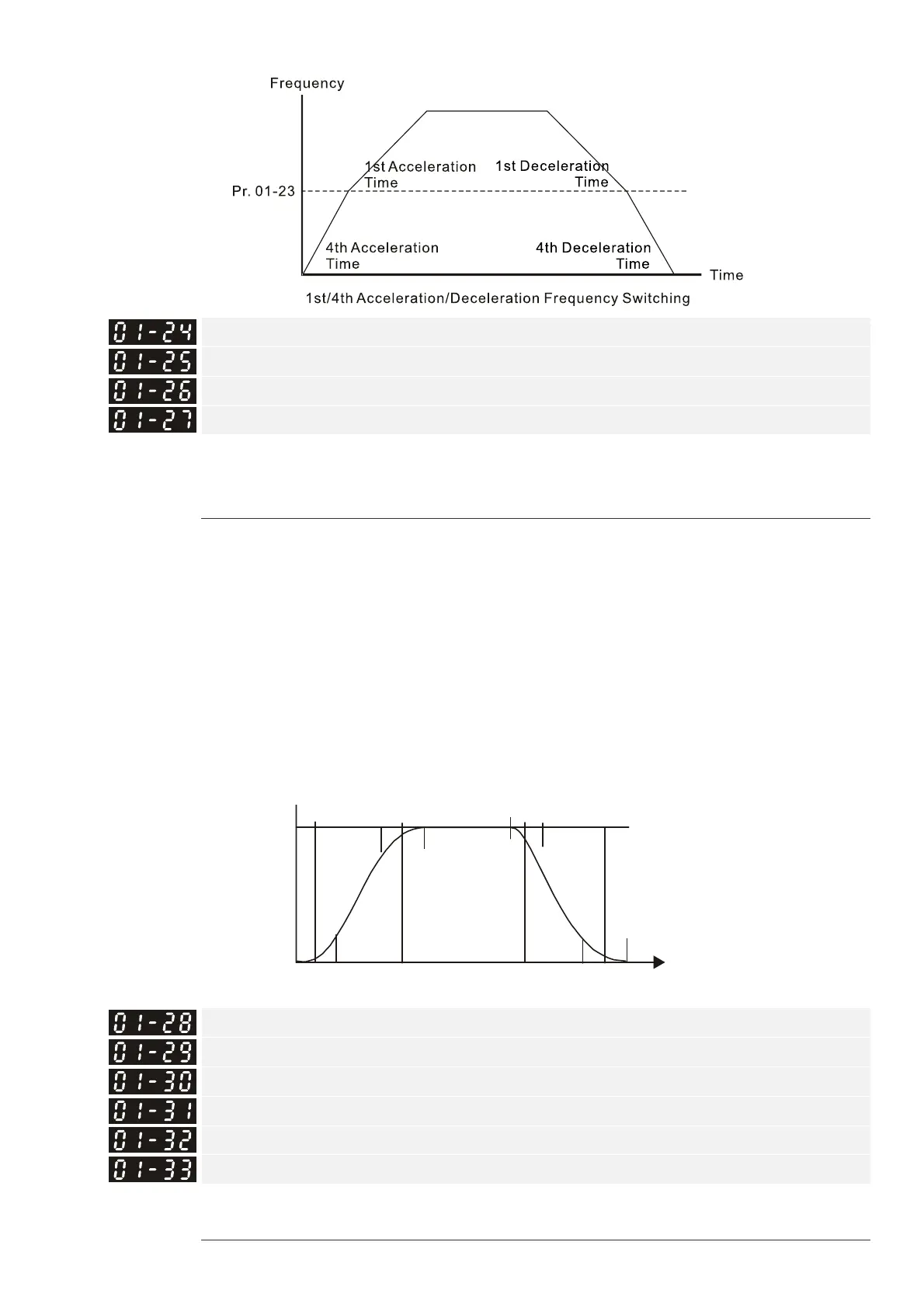 the actual acceleration time = Pr.01-12, Pr.01-14, Pr.01-16, Pr.01-18 + (Pr.01-24 + Pr.01-25) / 2