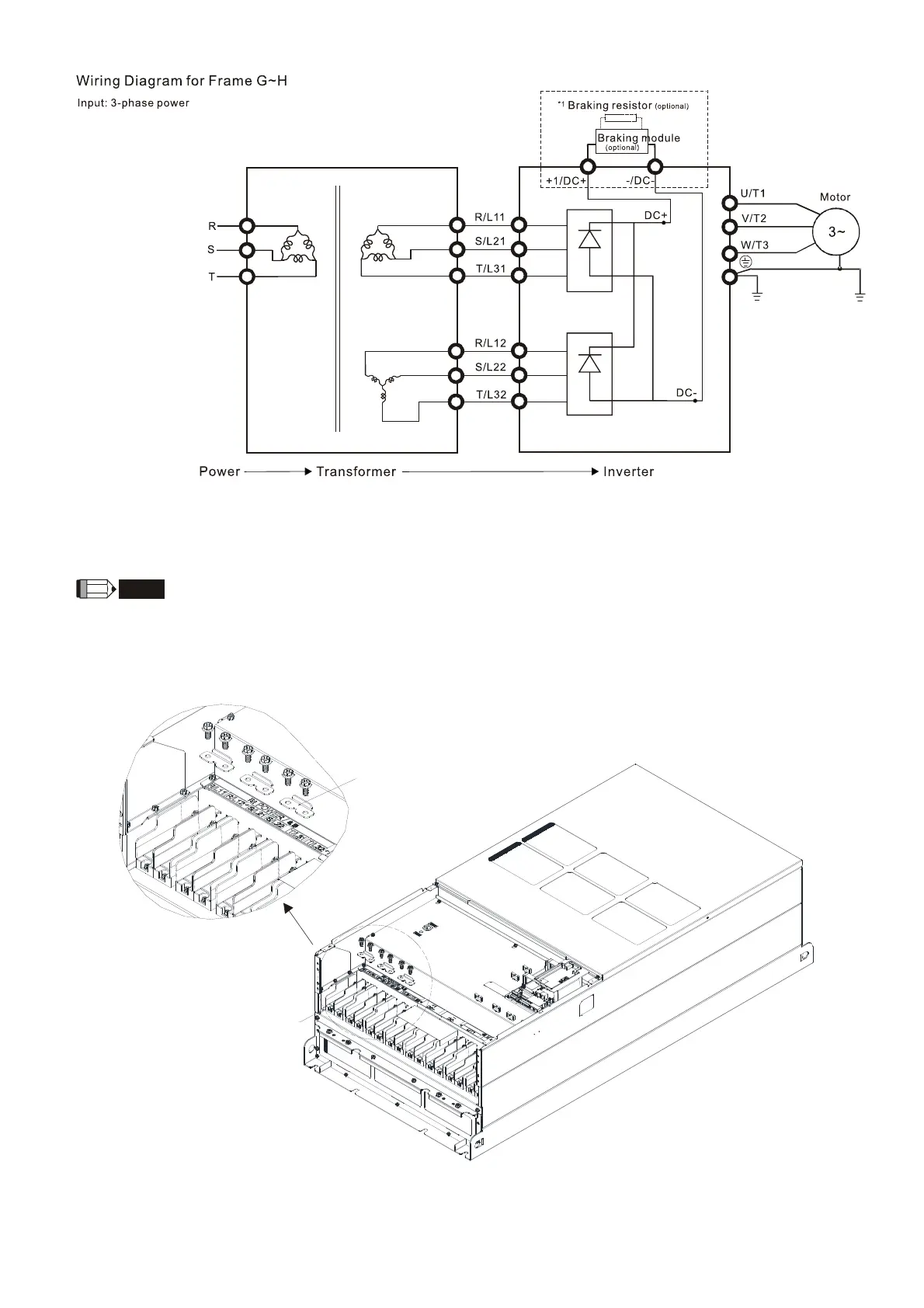 Please remove short circuit plate of Frame G and H if 12 pulse is implemented. Before implementing 12 pulse,