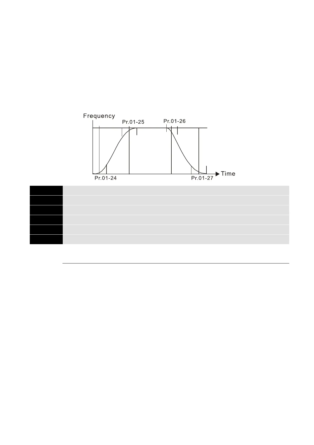 the actual acceleration time = Pr.01-12, 01-14, 01-16, 01-18 + (Pr.01-24 + Pr.01-25) ÷ 2.