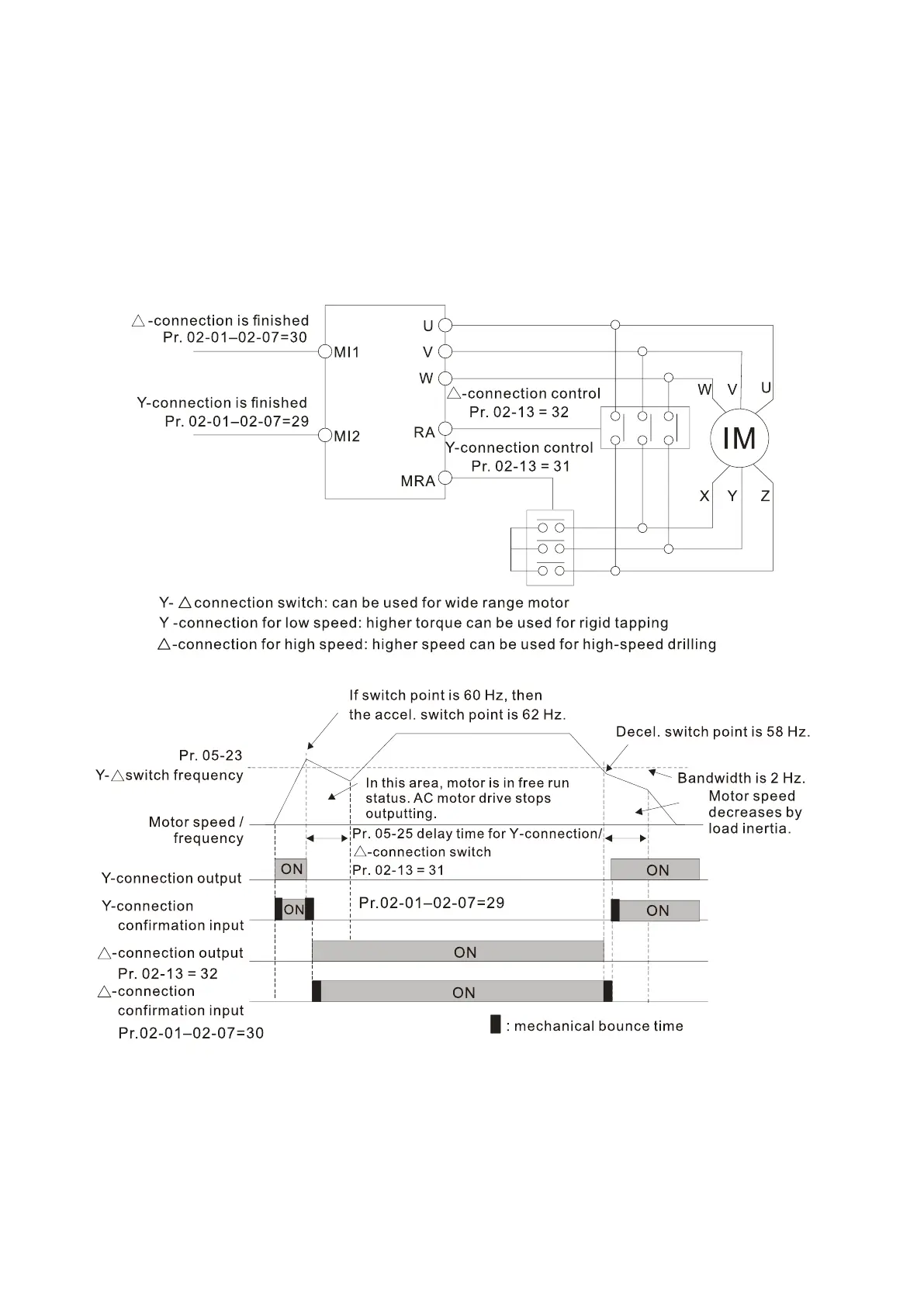 Pr.05-25 sets the switch delay time of Y-connection/-connection.