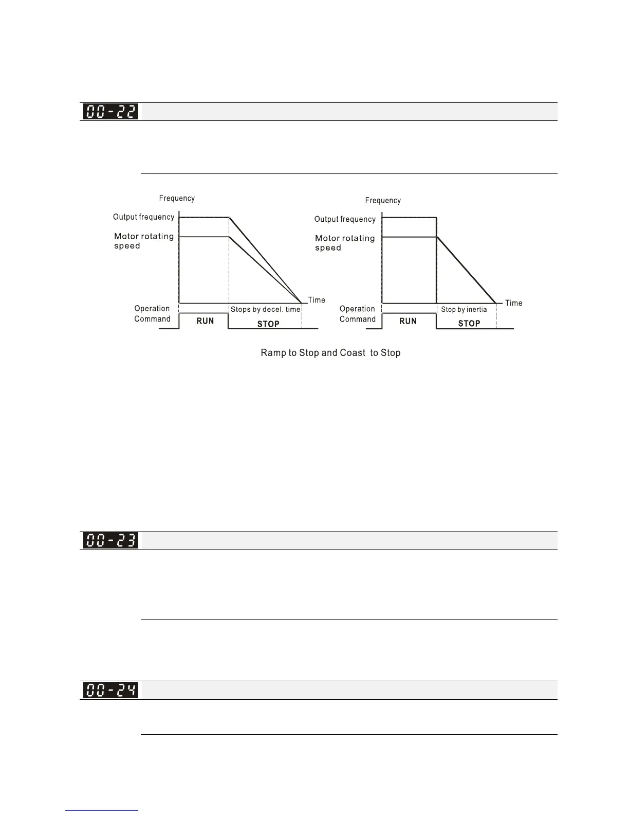 1. Ramp to stop: the AC motor drive decelerates to 0 or minimum output frequency (Pr. 01-09)