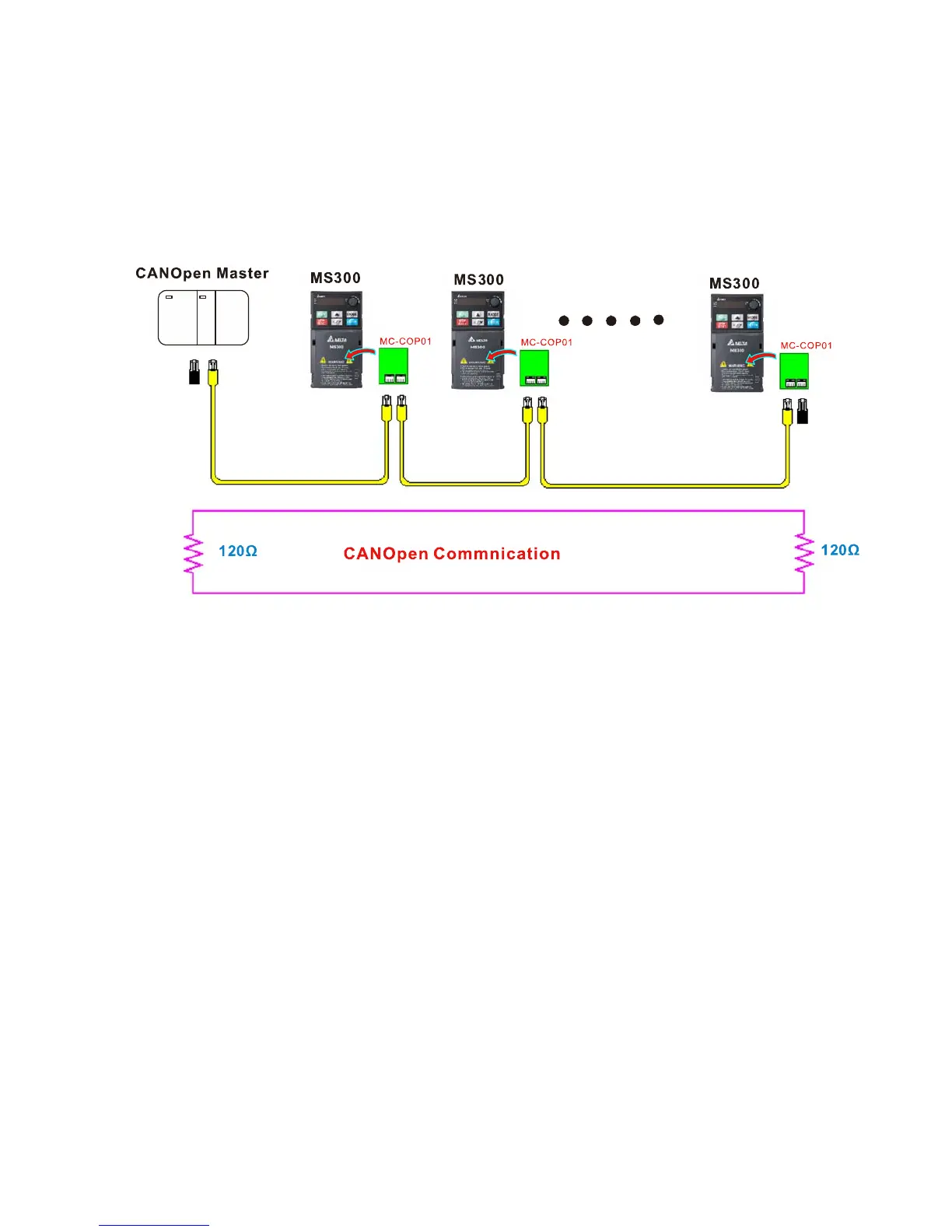 CANopen to MS300. The link is enabled by using RJ45 cable. The two farthest ends must be
