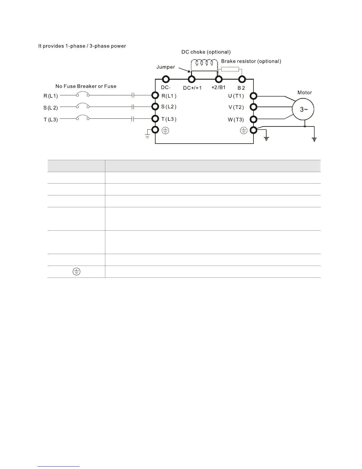 U/T1, V/T2, W/T3 Motor output terminals for connecting 3-phase IM and PM motors.